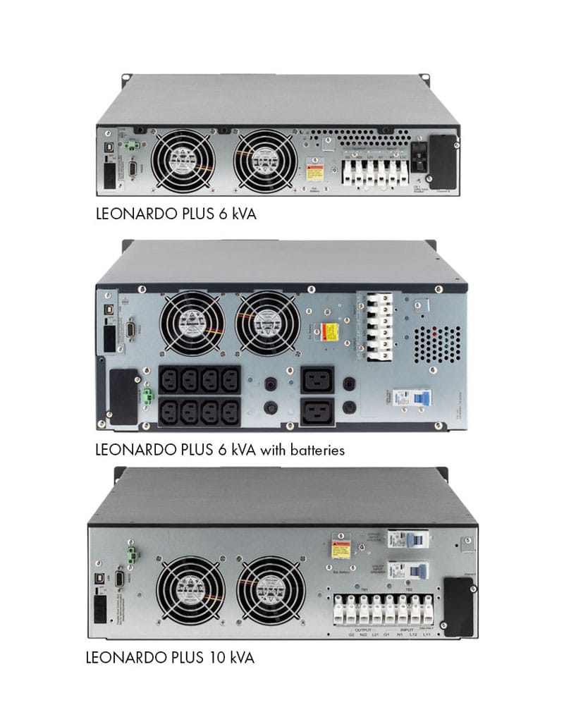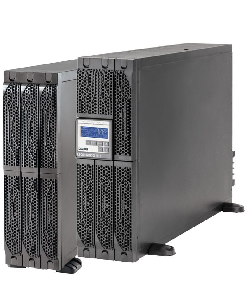 Leonardo Plus RT — это однофазный ИБП с онлайн-технологией двойного преобразования, предназначенный для установки как в напольном (tower), так и в стоечном (rack) варианте благодаря реверсивной конструкции. ИБП Leonardo Plus RT идеально подходит для сетей и серверов, а также небольших дата-центров, обеспечивая номинальную мощность 6 и 10 кВА.